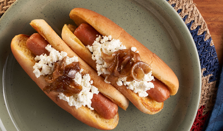 Hot Dog con queso de cabra y topping de cebolla caramelizada